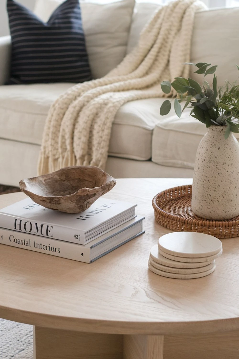 Stick to essentials like a tray, a small stack of books, a plant or natural element, and one decorative object. Keep everything cohesive and uncluttered.